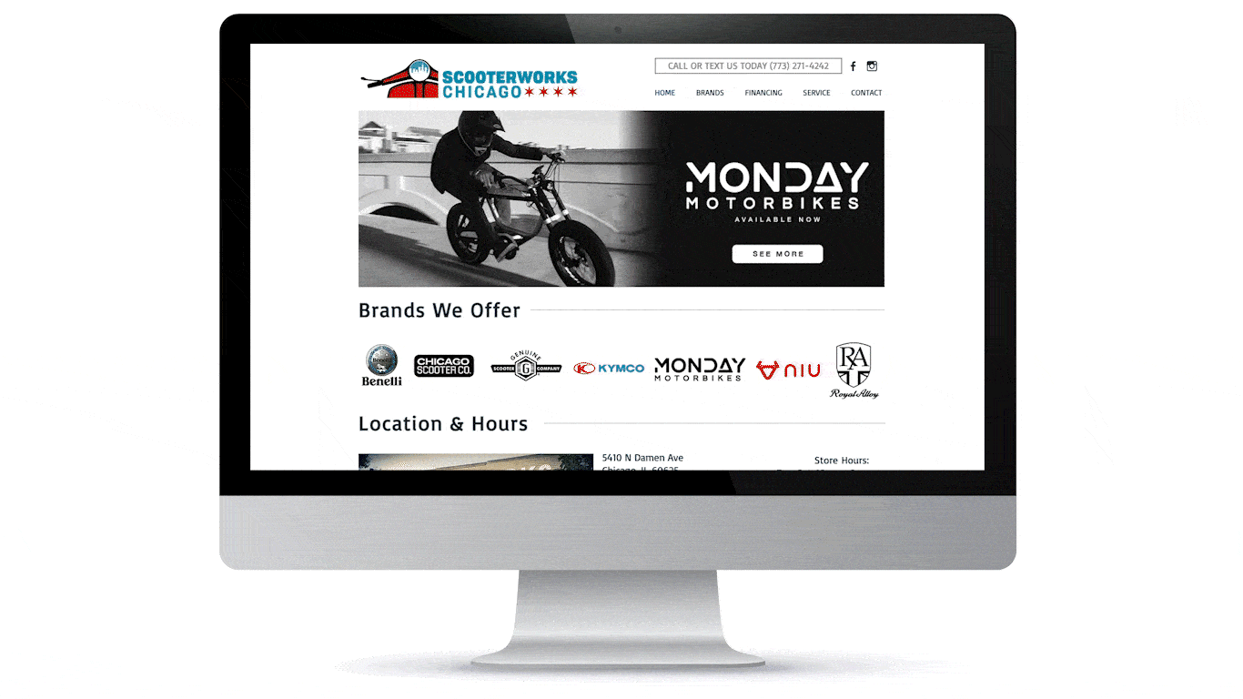 The goal for our flagship dealership Scooterworks Chicago was to create an easy to navigate website that showed exactly what was being offered. Previous website designs caused confusion, so I designed it with that in mind. Starting with the home page it includes all the necessary information a consumer would look for (who we are, what we sell, where we are located, and how to contact us). I continue to manage the website.