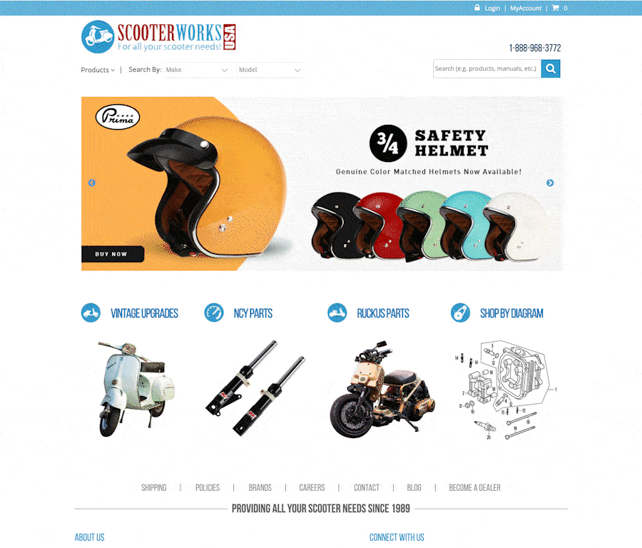 Similar to the Genuine Scooters website, Scooterworks needed an overhaul. It had been several years since an update and while it was mobile friendly, it was frankly not great. I created the UX/UI design for the site and came up with the page layout design. Since launching we have seen increased traffic from desktop and mobile users. I continue to manage and create landing pages for the site.